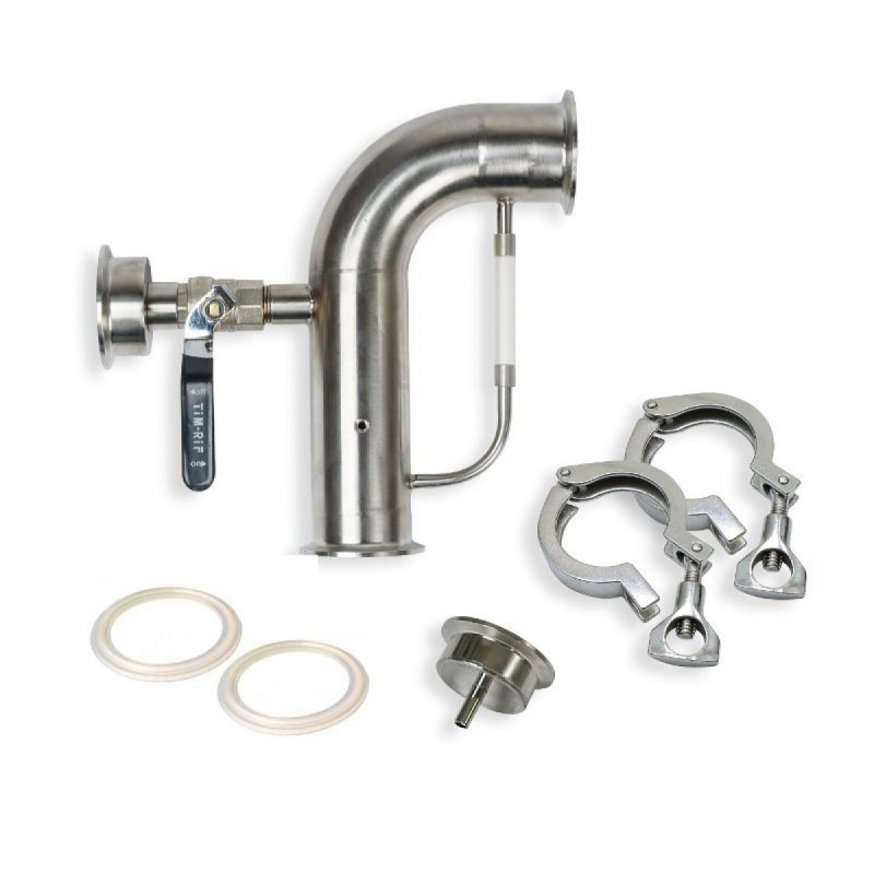 В комплект узла отбора входит сам узел отбора на 1.5 дюйма, шаровый кран на 1/2 дюйма, фланец 1.5 дюйма с резьбой, носик слива продукта, два кламповых хомута на 1.5 дюйма, две силиконовых прокладки на 1.5 дюйма.