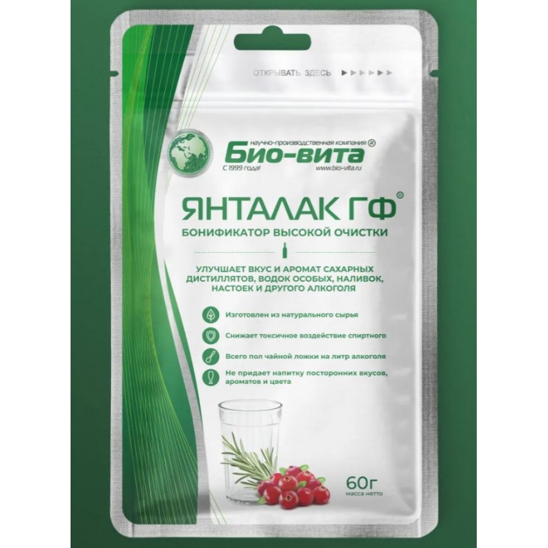 «Янталак ГФ» - бонификатор, содержащий пять групп углеводов. Был создан технологами ООО «Био-Вита» в 2001 году. Изначально разрабатывался для применения в ликероводочной промышленности, поэтому учитывает все особенности производства спиртосодержащих напитков.