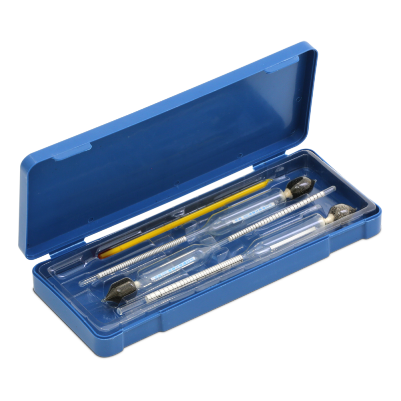 Ареометр выполнен в виде стеклянной колбы с грузом на конце. Комплект состоит из трёх ареометров, одного термометра, пластиковым футляром и инструкцией с температурной таблицей.